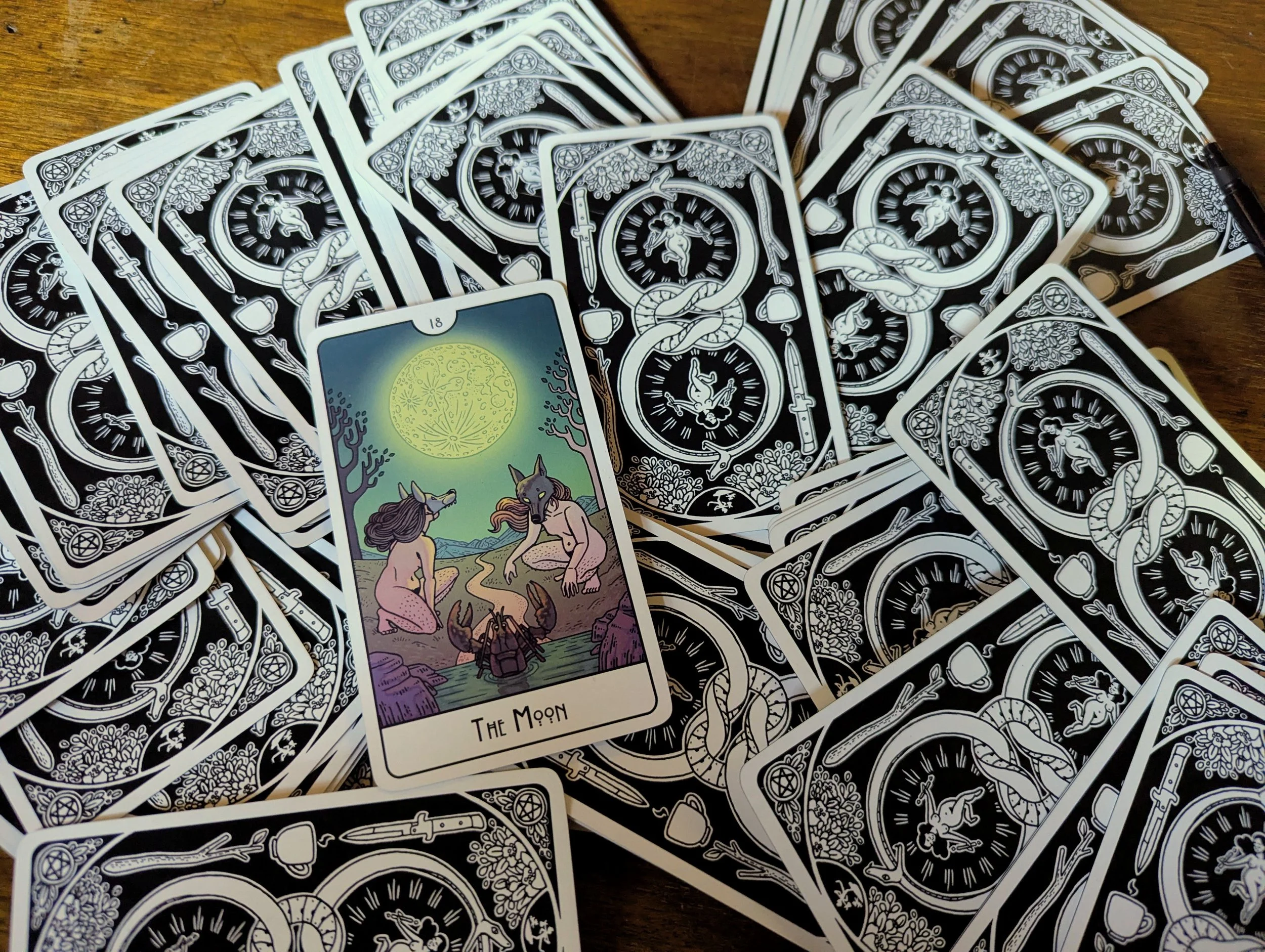 When I was a child, I had a waking dream that there was a lobster guarding the bottom of the stairs. Preventing me from using the bathroom. I pulled this card to help guide me to prepare myself for the ongoing turbulent changes happening in an aspect of my life. (Changes beyond anyone’s control FYI.) The moon card reminded me that not knowing is terrifying, but incredible ideas and insight can come out of this chaotic space. And importantly, that the lobster is the nameless, hideous tendency of our worst impulses or debilitating fears from our unconscious. This is all very helpful, but it also made me remember and reflect on this recurring dream I had a few times when I was 6 or 7 years old. I had no real context for lobsters, except probably through the TV. I still have never eaten lobster at 45 years old. But as I mentioned, these cards can help me think and process.